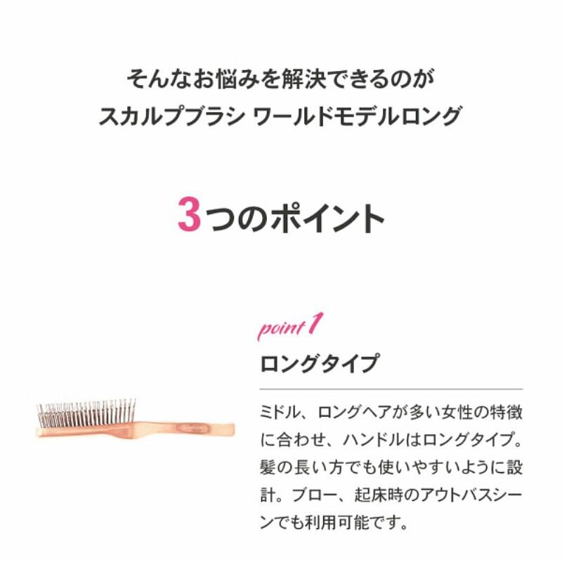 プロも愛用するスカルプブラシ。毎日のシャンプー習慣にブラシをプラスすることで髪のボリューム、パサつき、うねり、切れ毛、枝毛、頭皮の臭いにお悩みの方におすすめです。ハンドルはロングタイプで髪の長い方でも使いやすい設計、毛玉2段植毛で2種類の硬さの違う376本のピンが髪をすくい上げるので、根元からふんわり立ち上げ、髪にボリュームと艶を出します。ブロー、起床時のアウトバスシーンでもご利用可能です。