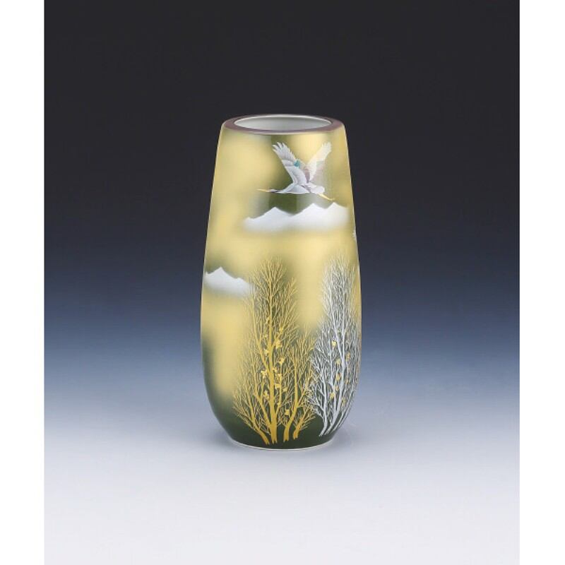 九谷焼 8号筒形花瓶 金箔木立連山に鶴 130549