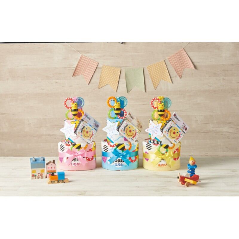 大人気ブランドSassyで組み立てられたおむつケーキ。全て無駄がなく捨てるところがない贈り物です。