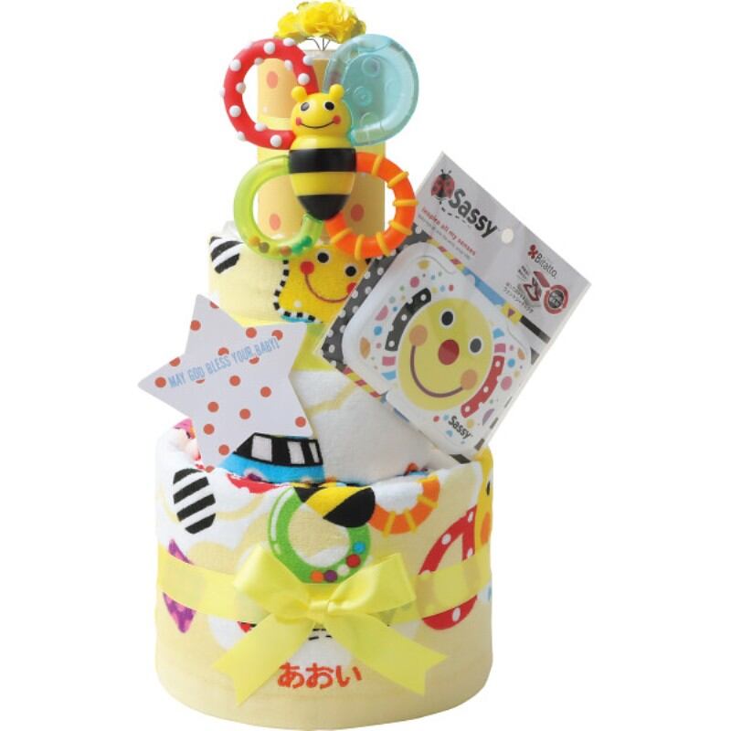 大人気ブランドSassyで組み立てられたおむつケーキ。全て無駄がなく捨てるところがない贈り物です。