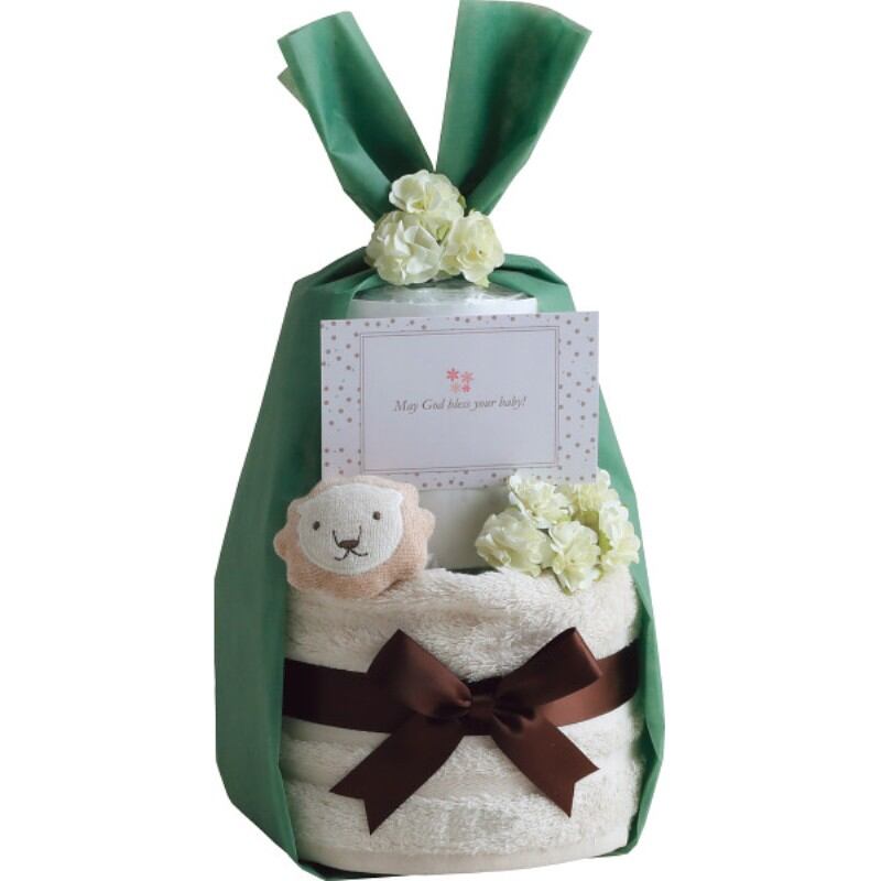 全てオーガニック素材で組み立てられたおむつケーキ。全て無駄がなく捨てるところがない贈り物です。