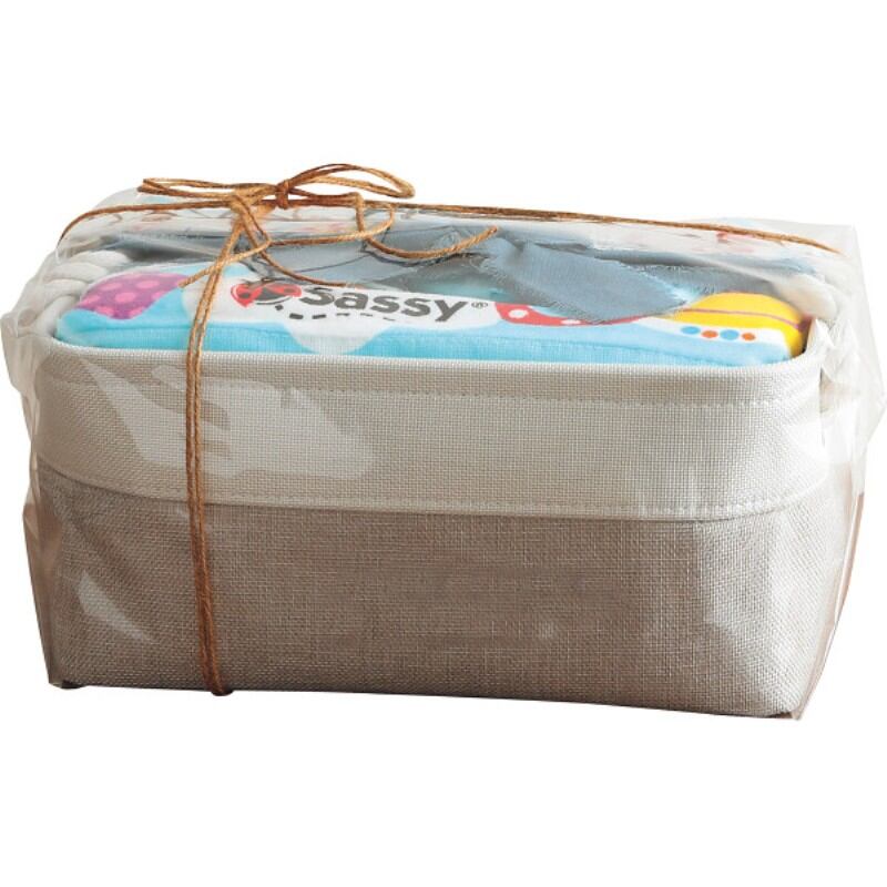 お子様の成長とともに、おむつストッカー・トイボックス等、様々な用途に使えるバスケットと、身長計バスタオルが付いたギフトセットです。