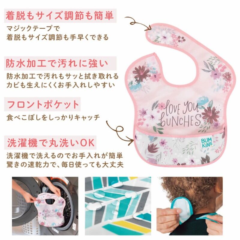 バンキンスのロングセラー、お食事エプロン。洗濯機で洗えてすぐ乾くのでお手入れも簡単。幅広マジックテープだから首元のサイズ調節がしやすく防水加工済で拭き取りも簡単。軽くて薄いから持ち運びにも最適。フロントポケット仕様だから食べこぼしや飲み物を倒した時のお洋服の汚れも最小限に。何枚あってもうれしいから出産祝いギフト・プレゼントにもおすすめ。