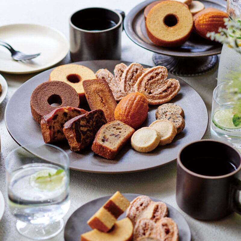 商品内容:●フィナンシェ・はちみつマドレーヌ・パルミエ×各4、マーブルケーク・マロンケーク×各1、ケークアングレ・バームクーヘンプレーン・バームクーヘンショコラ×各2、黒胡麻と黒糖クッキー・バニラクッキー×各5