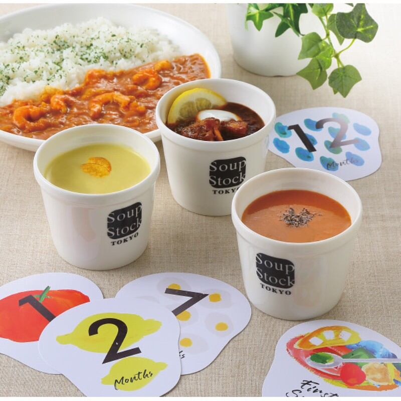 時間のない時でも電子レンジで簡単にお召し上がりいただけるスープストックトーキョーで人気のスープとカレーをセットにしました。お子様の月齢に合わせて、成長を記録できるベビーマンスリーカード付。